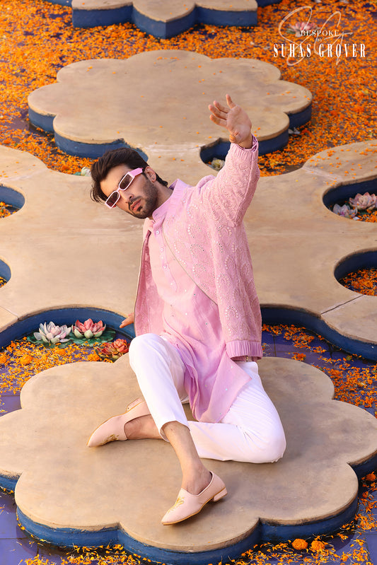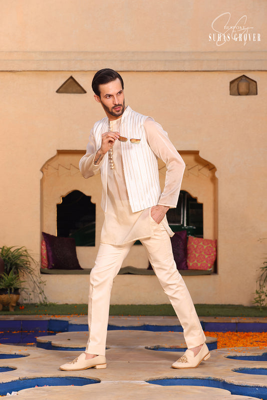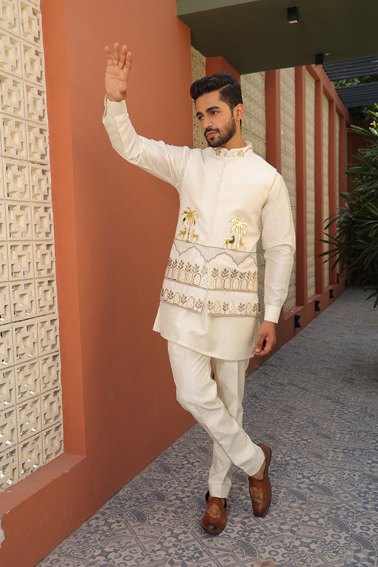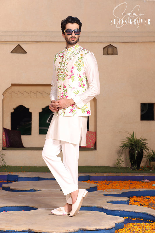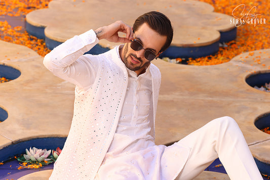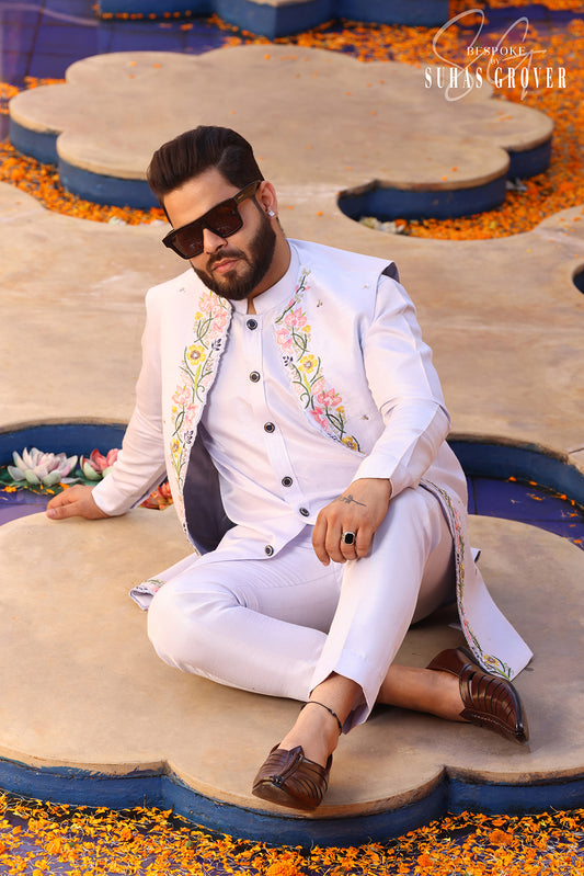 WHITE LUCKNOWI OPEN SHRUG JACKET SET