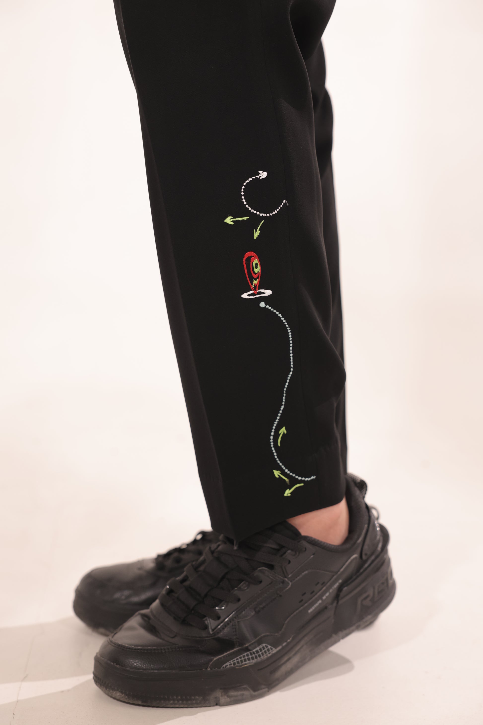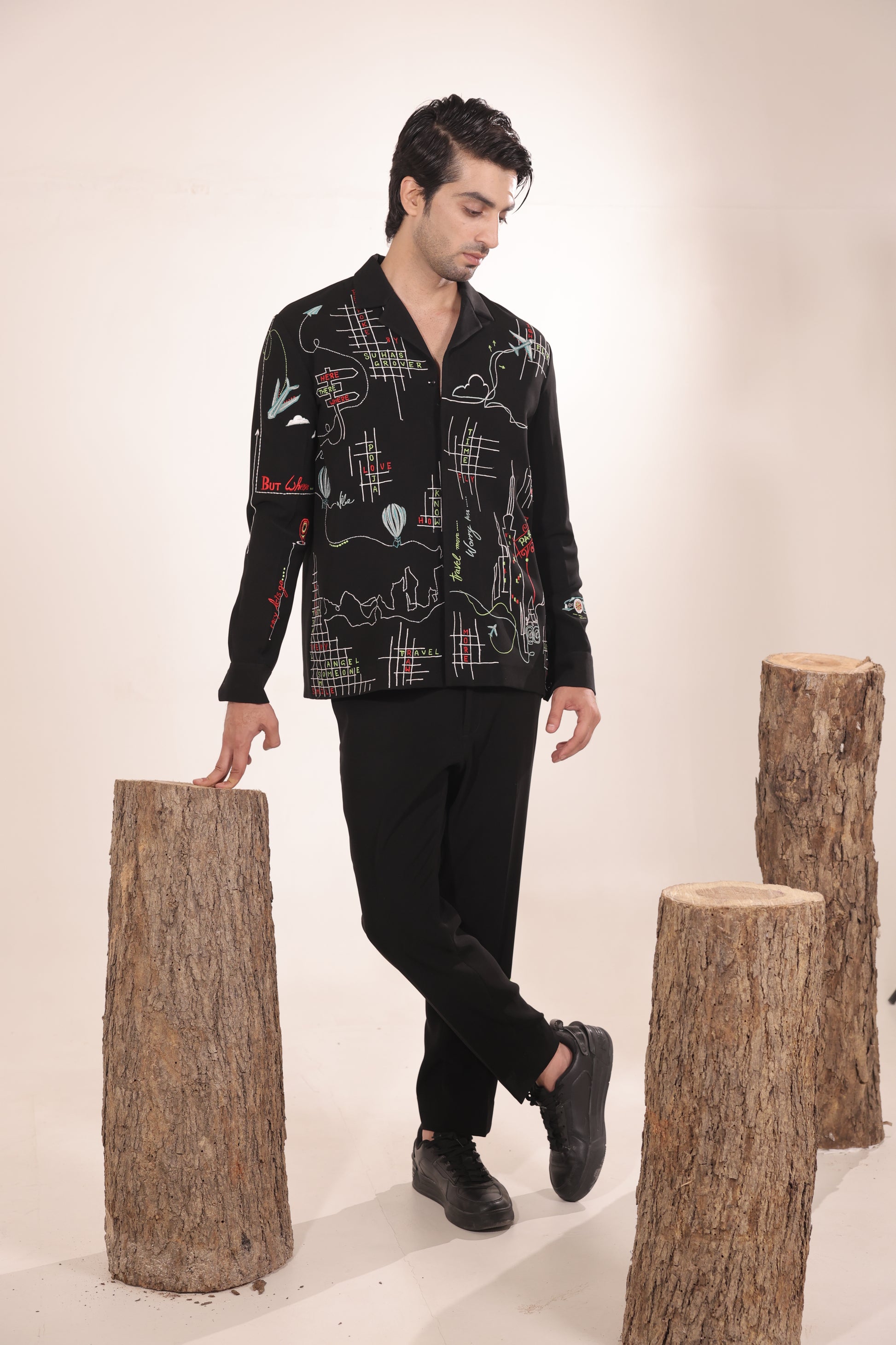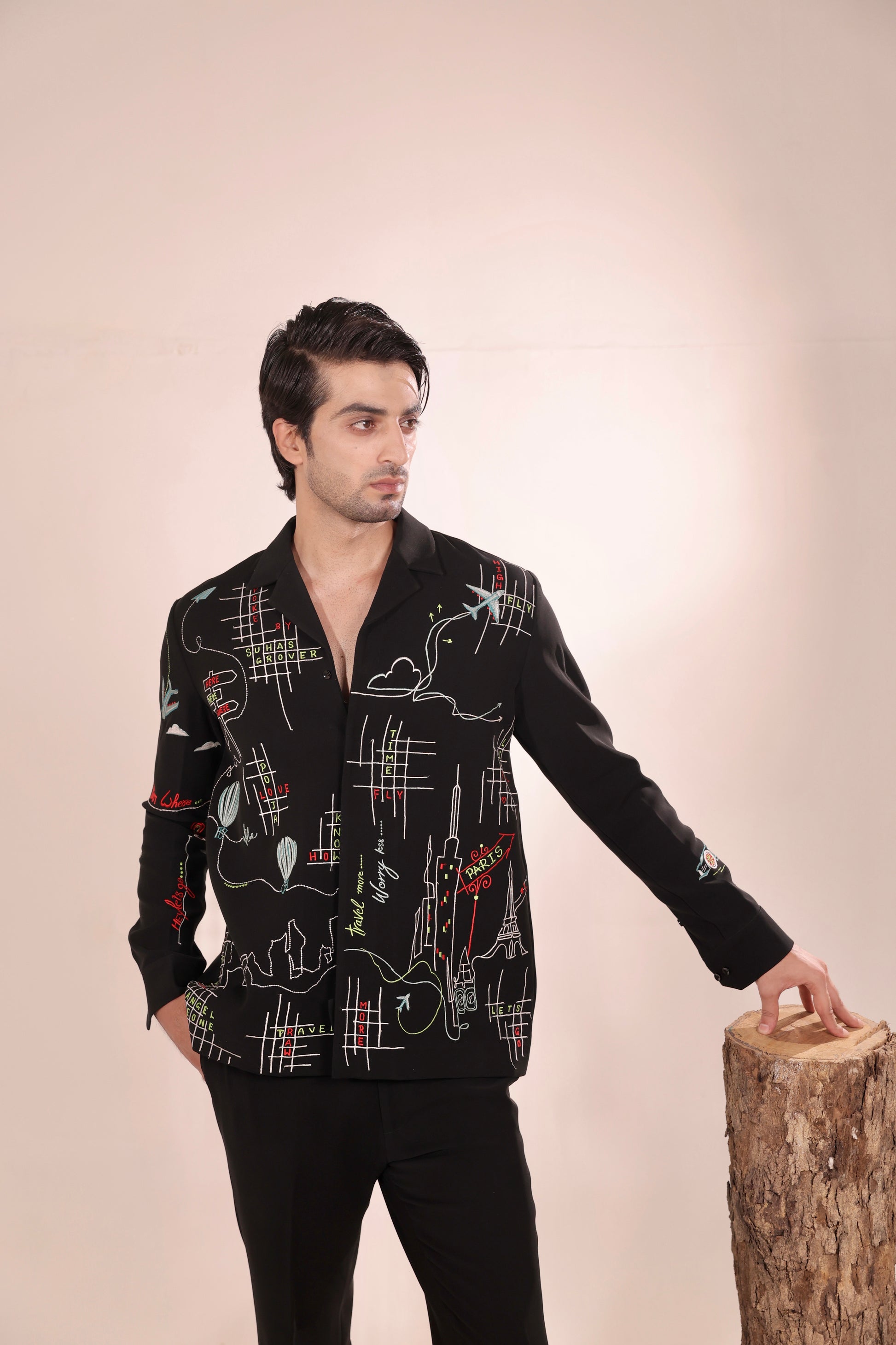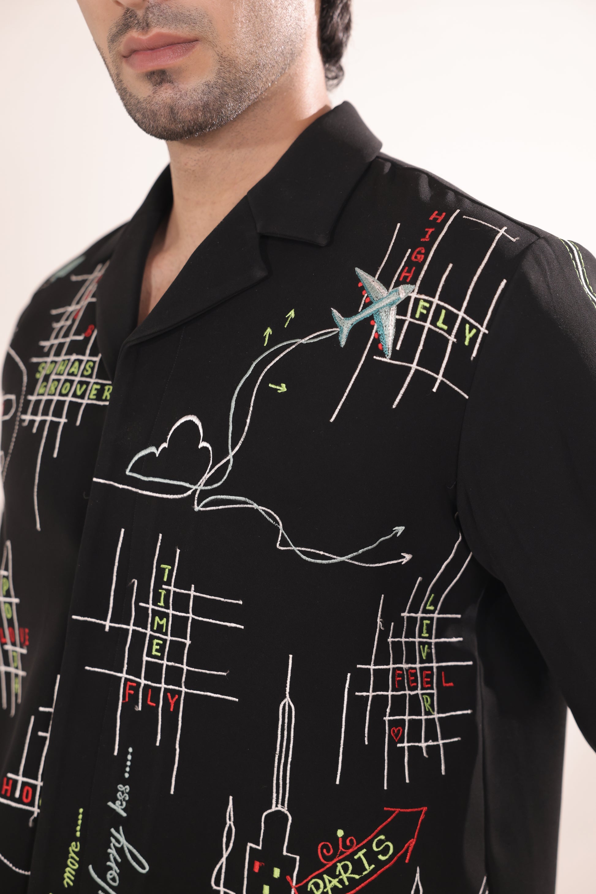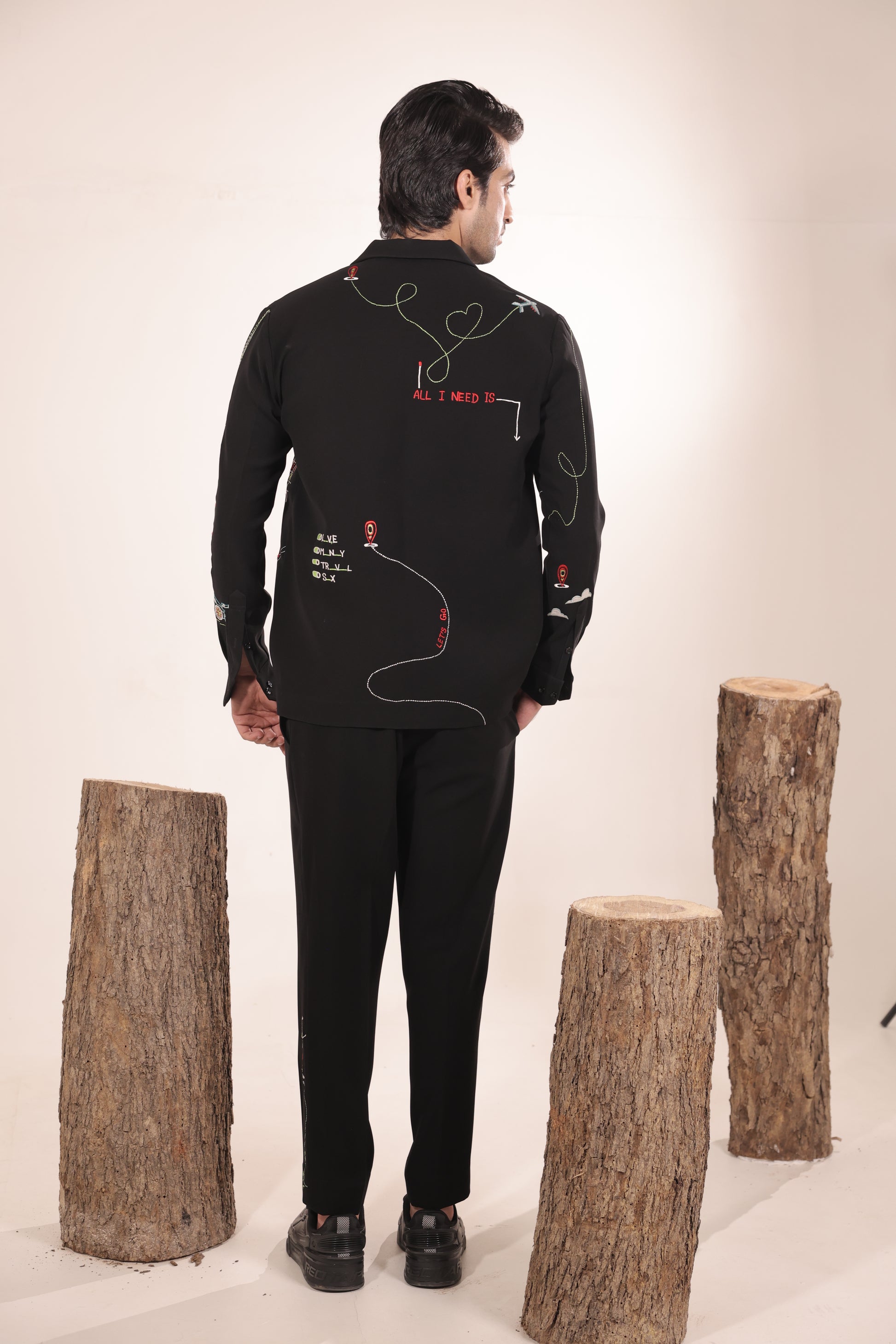 Featuring a black colour cord set in japenese lycra base with machine embroidery on it paired with black trouser. Perfect wear for parties , cocktail ceremonies & airport looks.