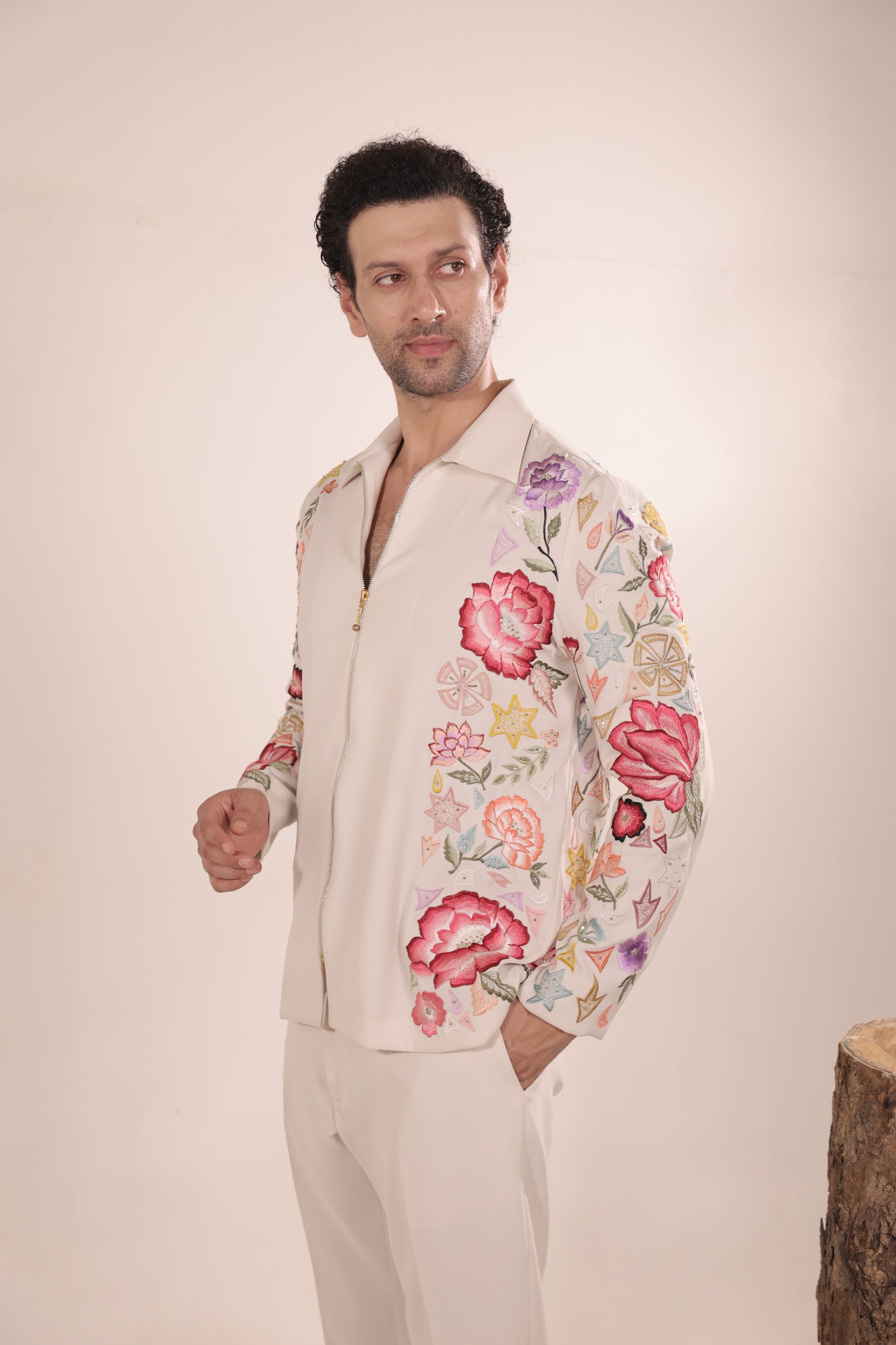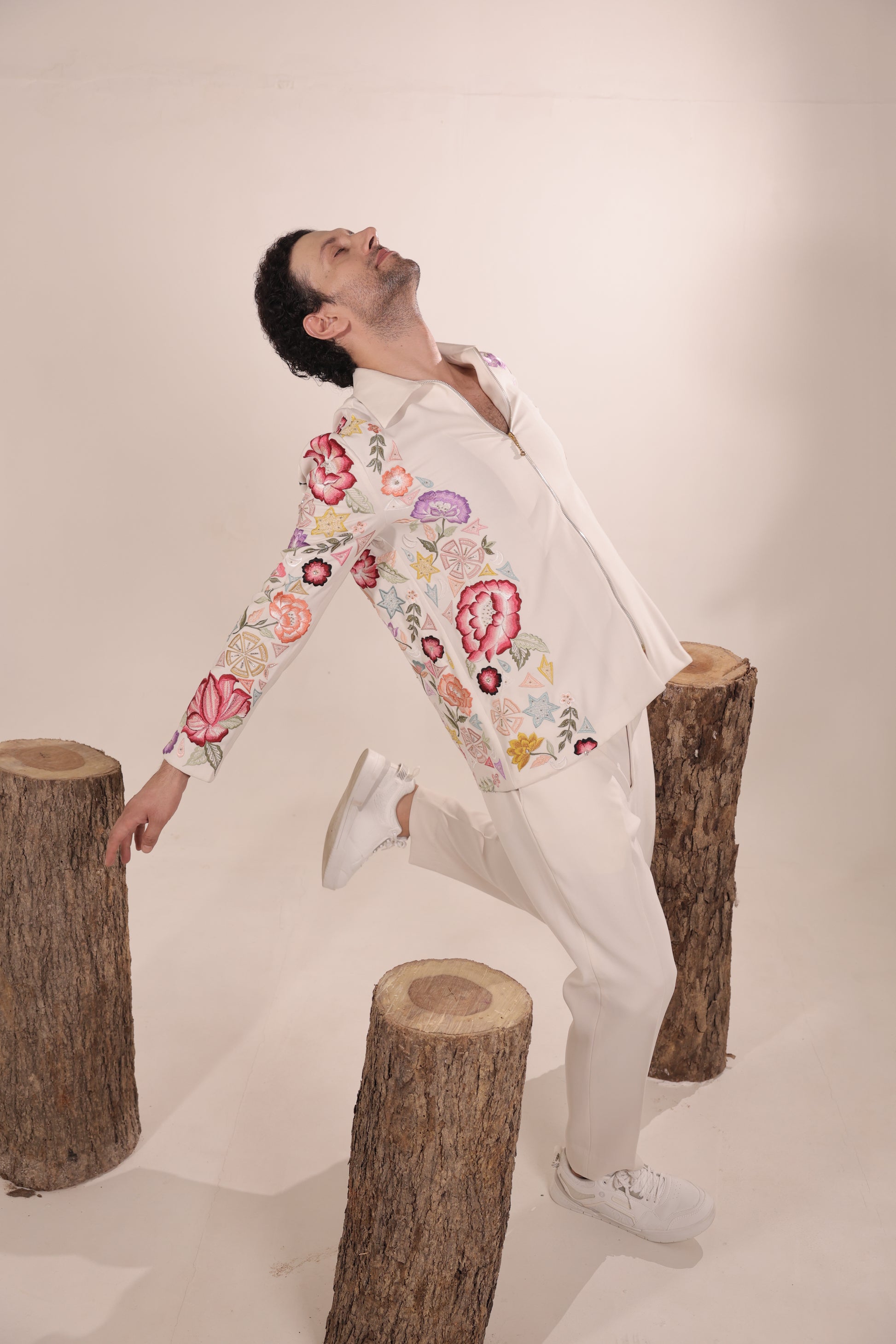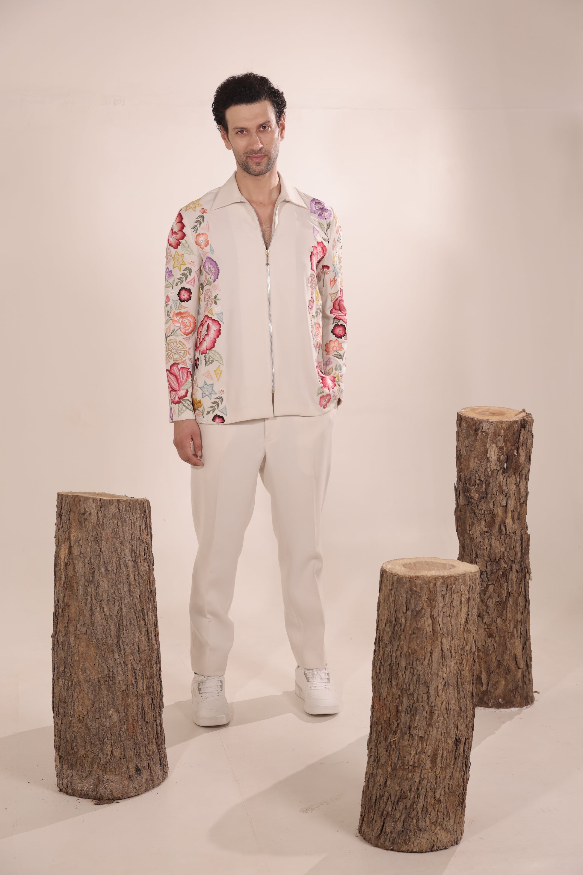Featuring a ivory colour cord set in japenese lycra base with machine embroidery on it paired with a straight fit trouser. Perfect wear for parties , cocktail ceremonies & airport looks.