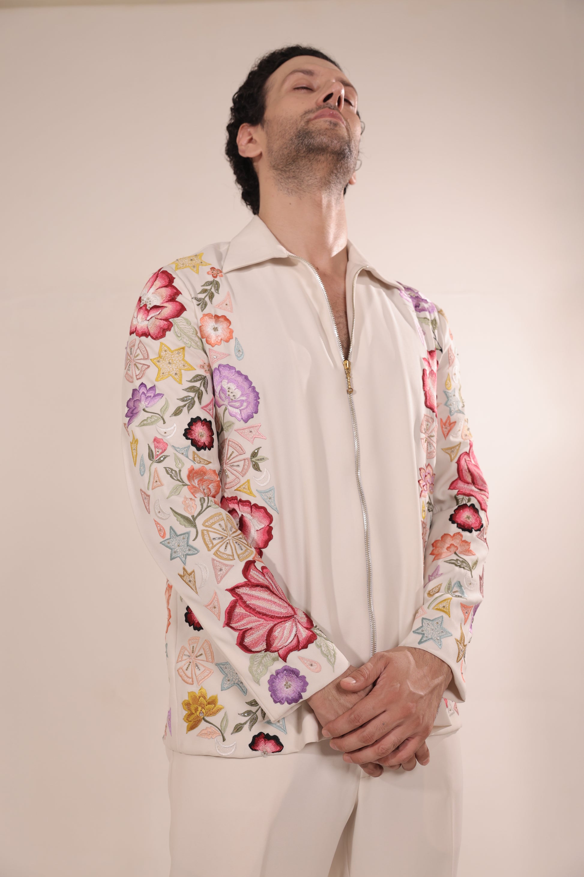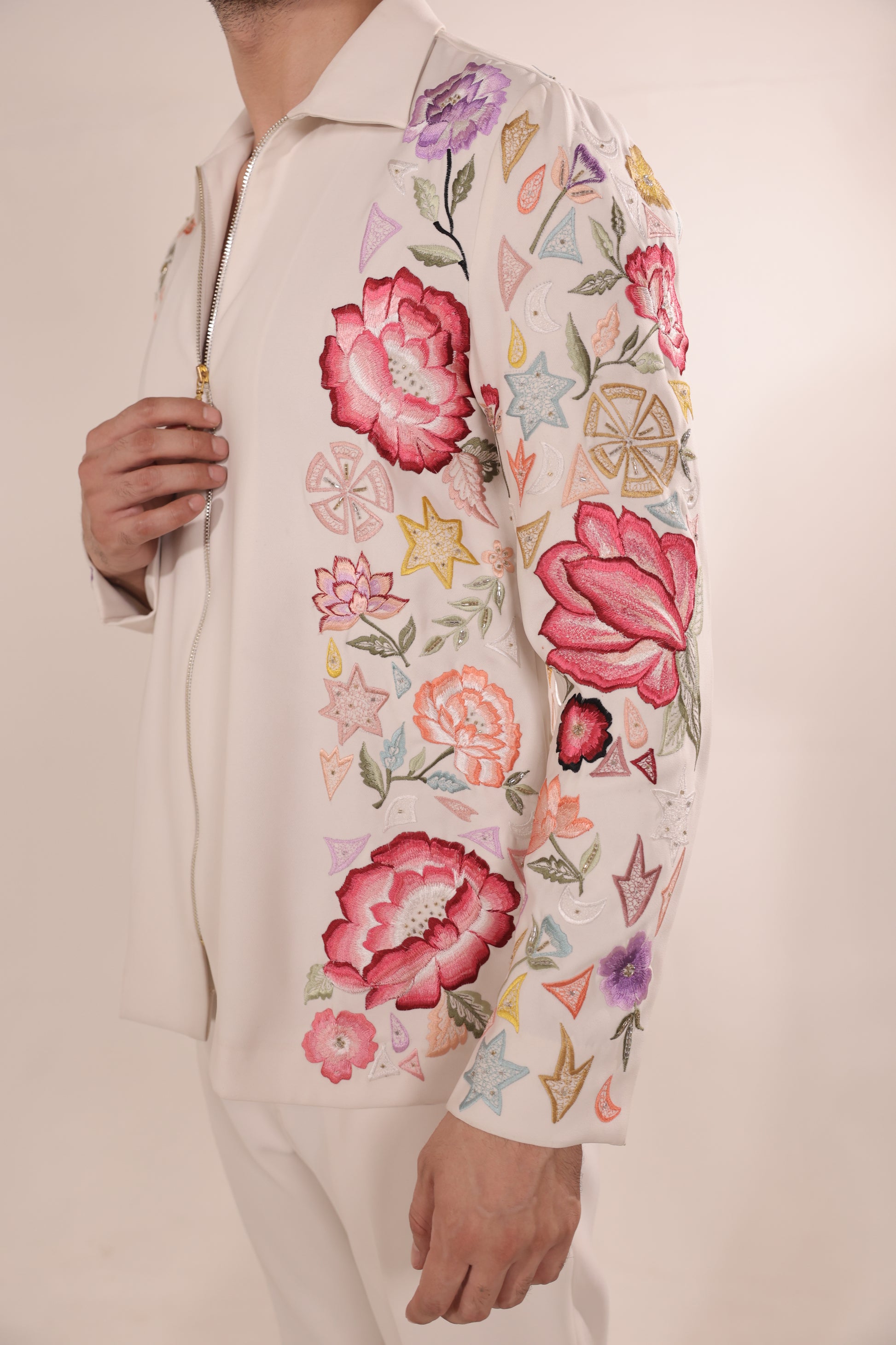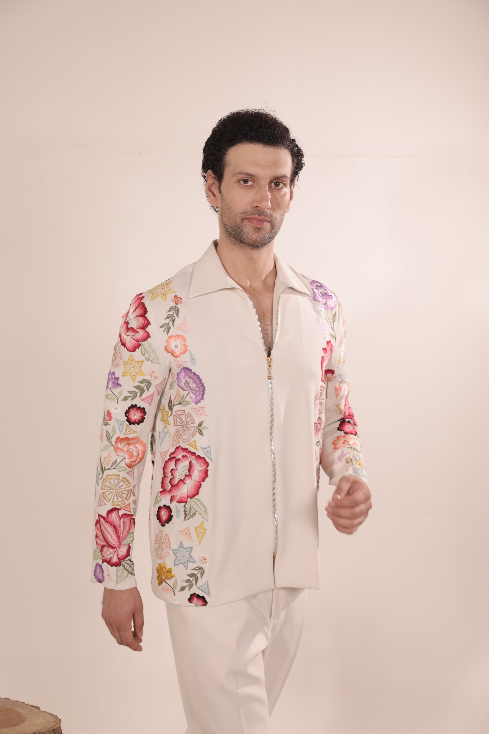 Featuring a ivory colour cord set in japenese lycra base with machine embroidery on it paired with a straight fit trouser. Perfect wear for parties , cocktail ceremonies & airport looks.