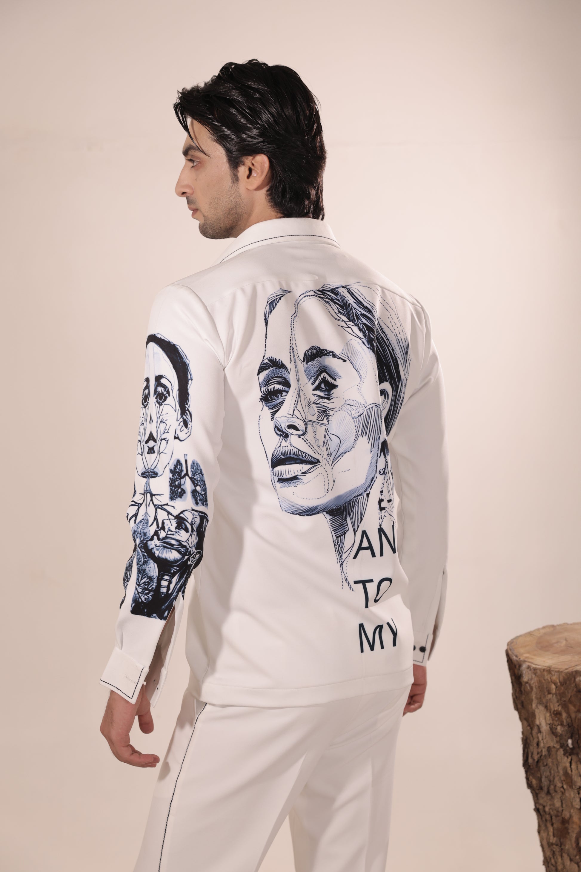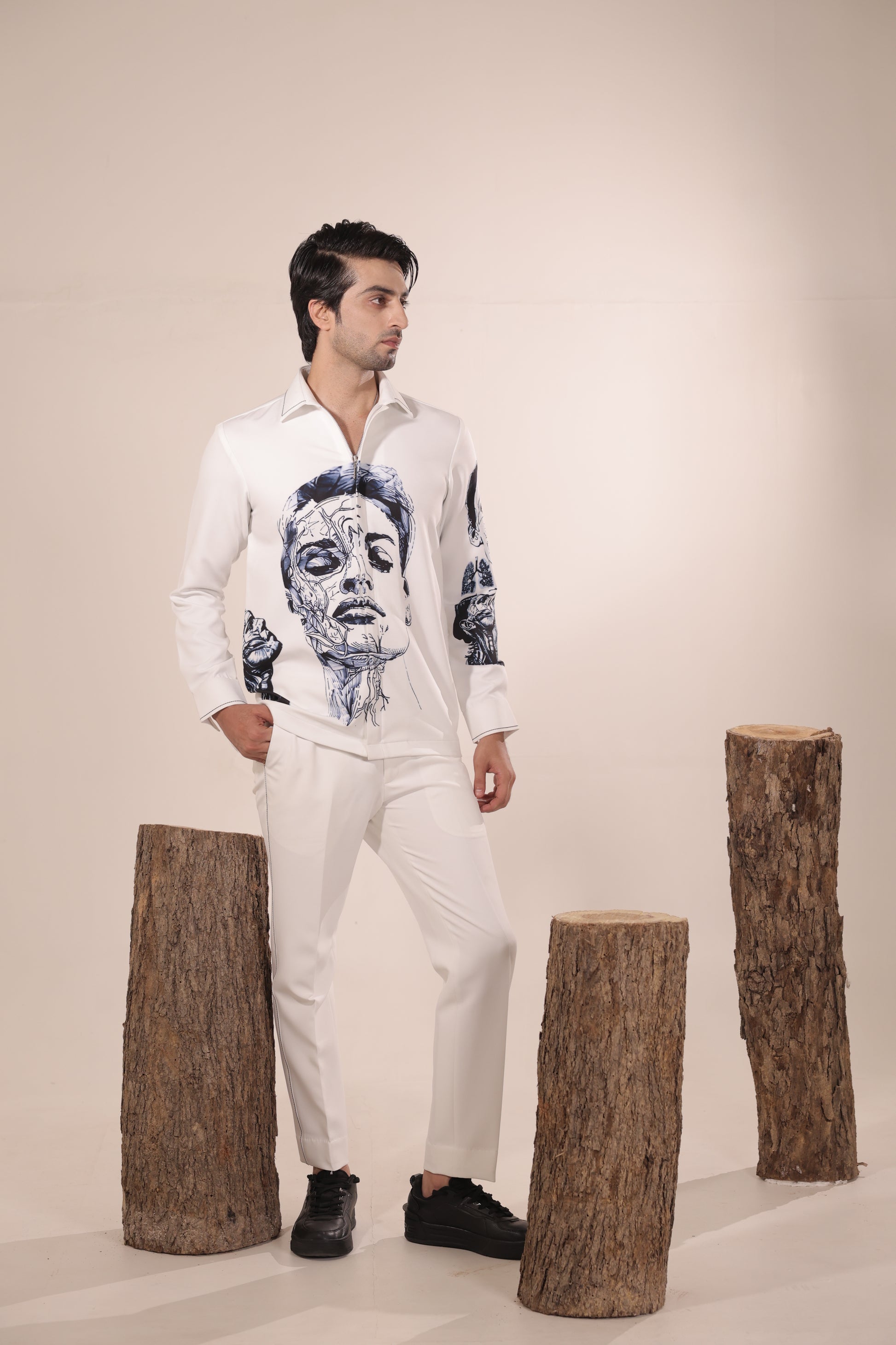 Featuring a white colour cord set in japenese lycra base inspired with anatomy paired with straight fit trouser. Perfect wear for parties , cocktail ceremonies & airport looks.