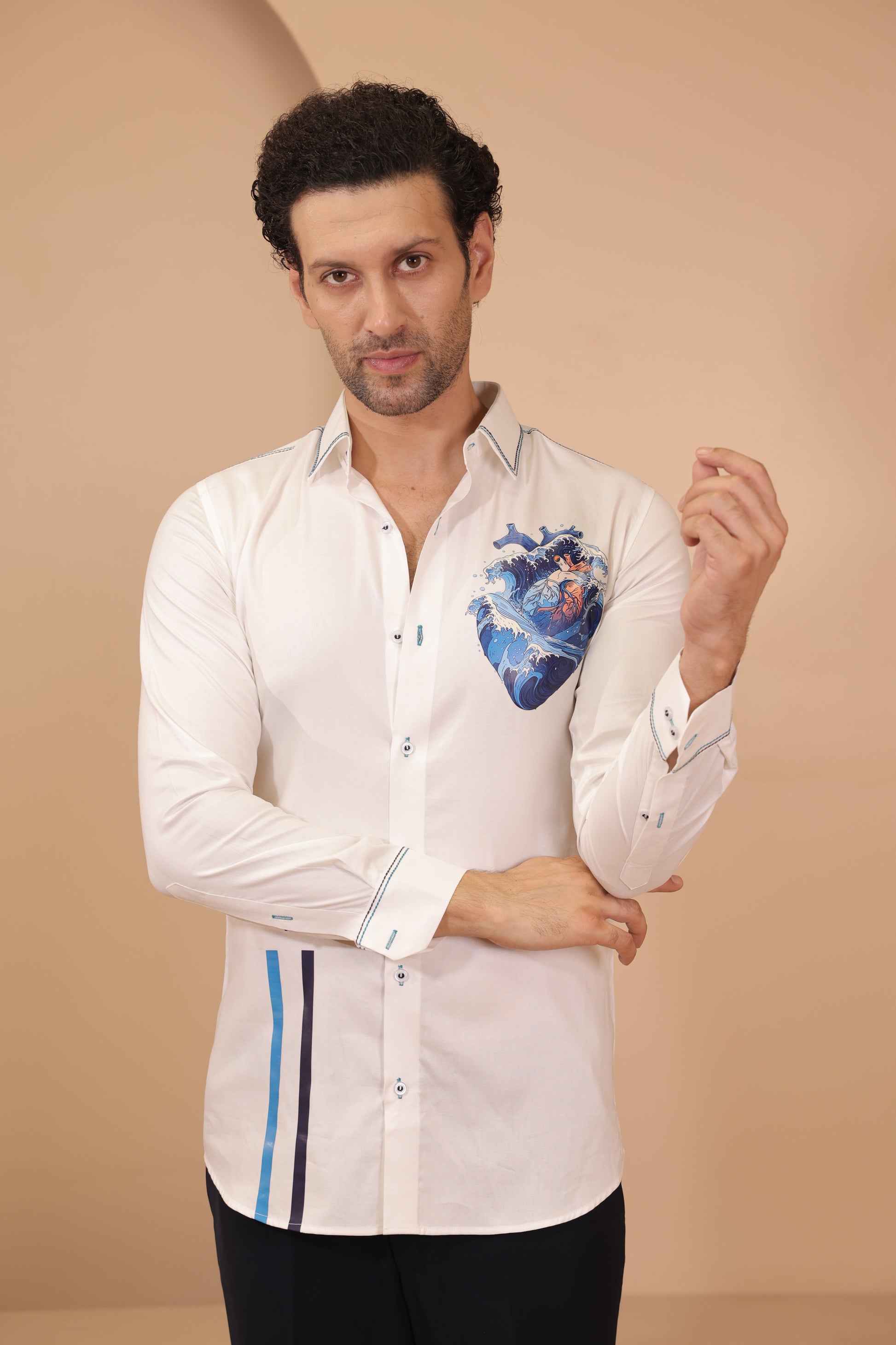Featuring a heart print shirt in cotton fabric. Perfect wear for parties and cocktail ceremonies.