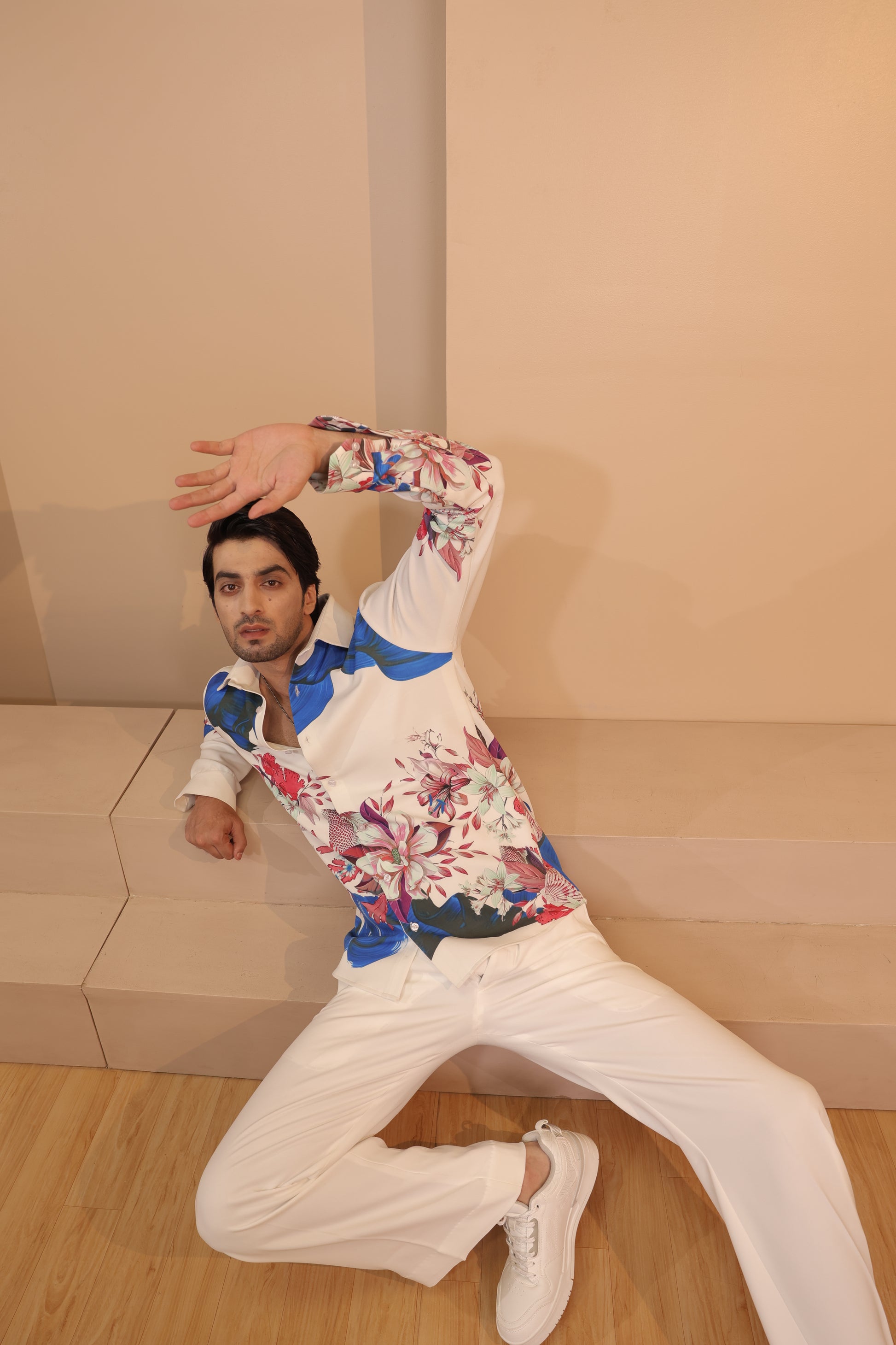 Featuring a floral shirt in japenese fabric. Perfect wear for parties and cocktail ceremonies.