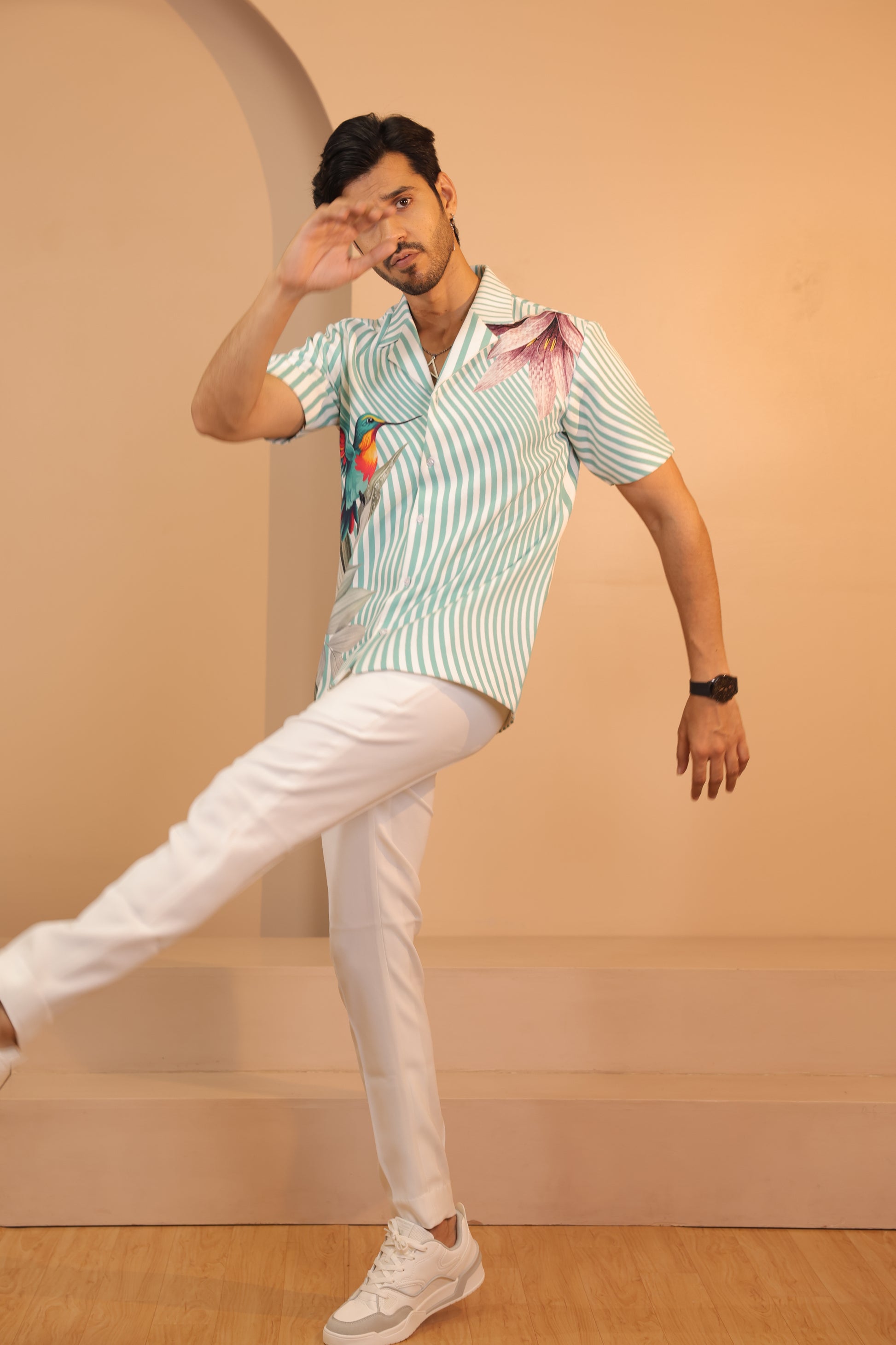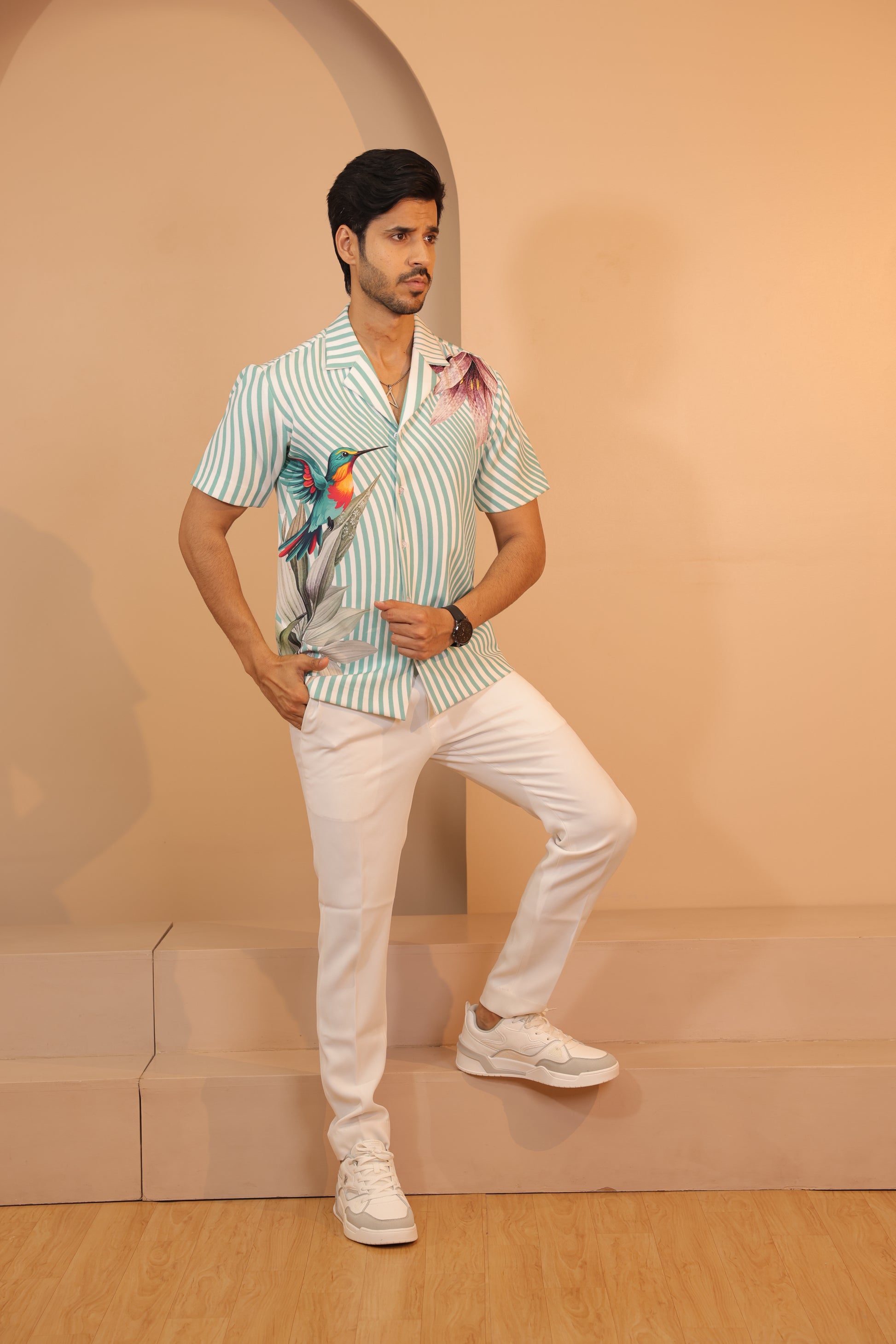 Featuring a sparrow shirt in japenese fabric. Perfect wear for parties and cocktail ceremonies.