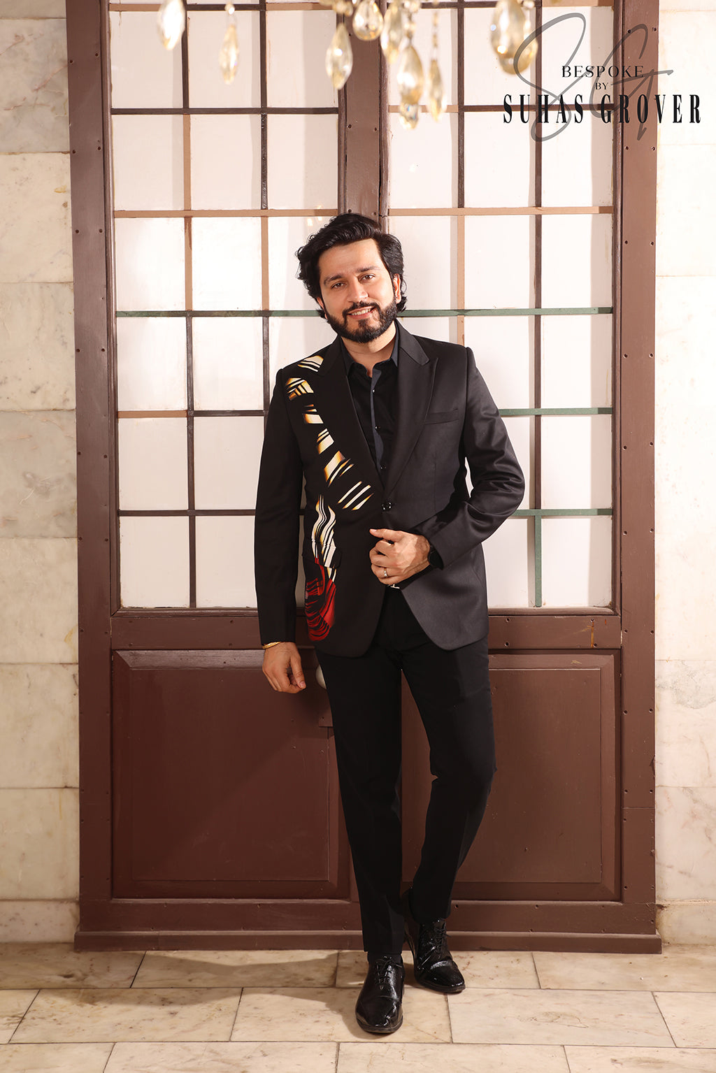 Featuring a black tuxedo jacket in japenese fabric with some modern art and a notch lapel. It is paired with a black cotton tuxedo shirt, a black japanese polyester bow, a pair of cufflinks and a black japanese streachable trousers . Perfect wear for reception or cocktail ceremonies.