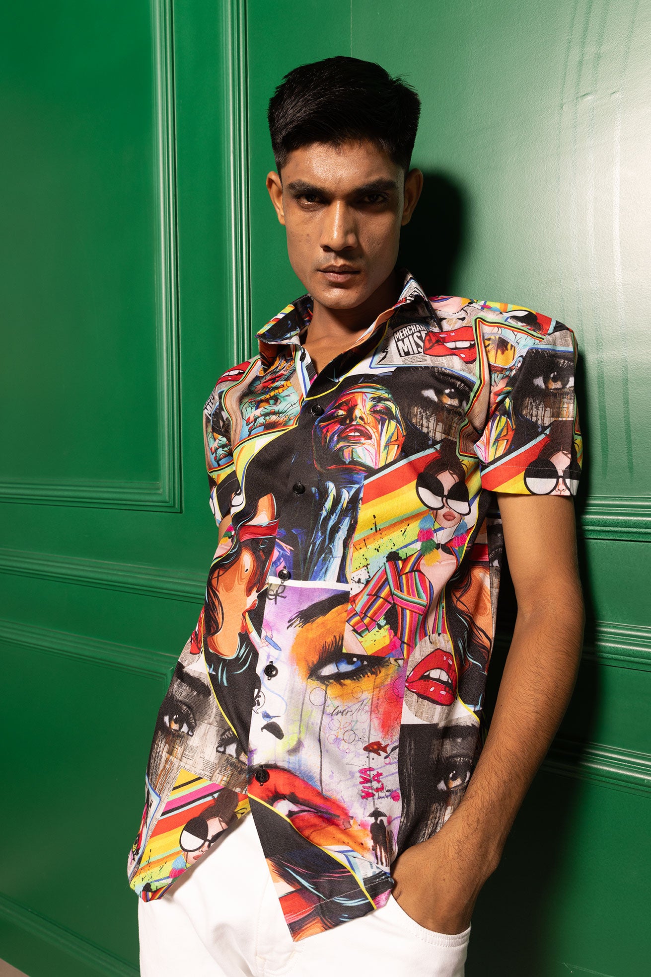 Featuring a printed shirt in cotton base with faces and cigar print on it . Perfect wear for parties and cocktail ceremonies.