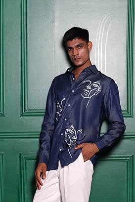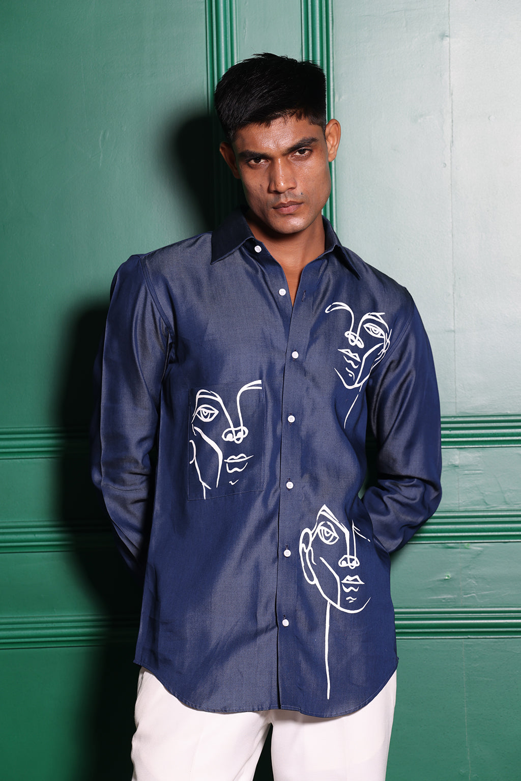 Featuring a blue colour shirt in cotton base with a abstract faces hand paint on it . Perfect wear for parties and cocktail ceremonies.