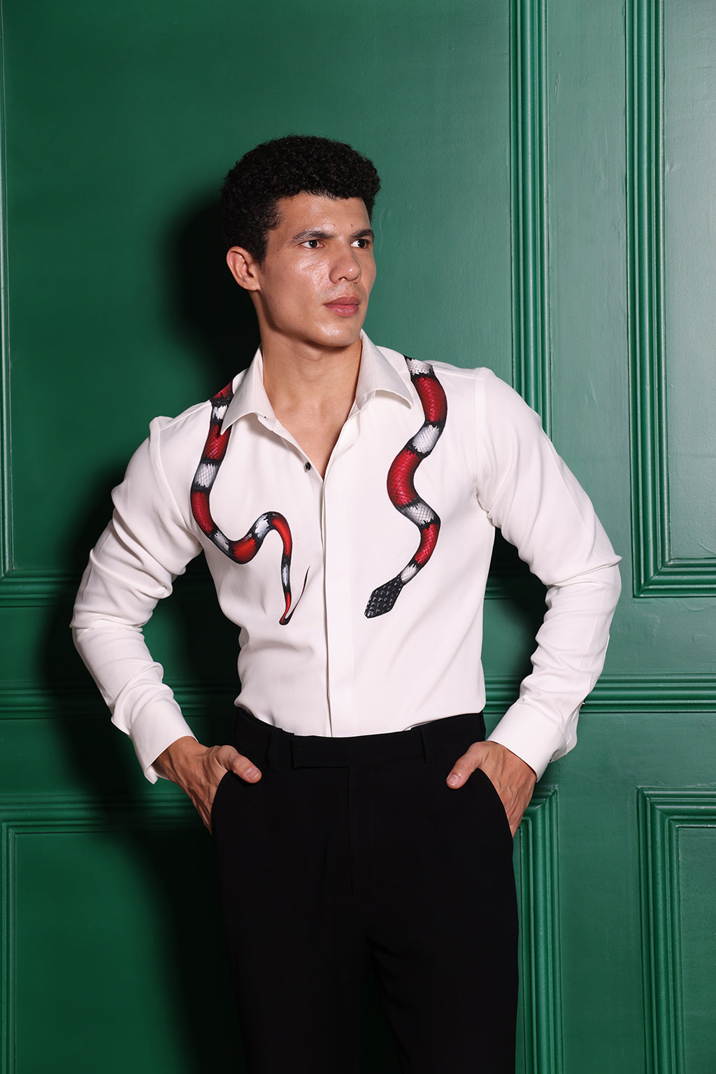 Featuring a white colour shirt in cotton lycra base with a handpainted snake on it . Perfect wear for parties and cocktail ceremonies.