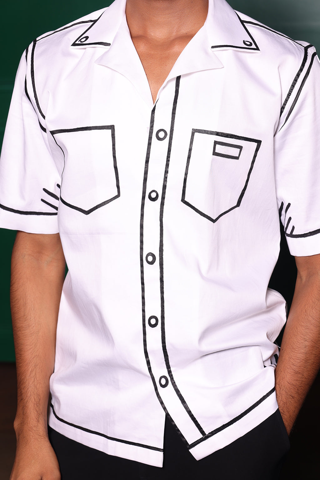 Featuring a white colour shirt in cotton base with a hand painted line drawing on it . Perfect wear for parties and cocktail ceremonies.