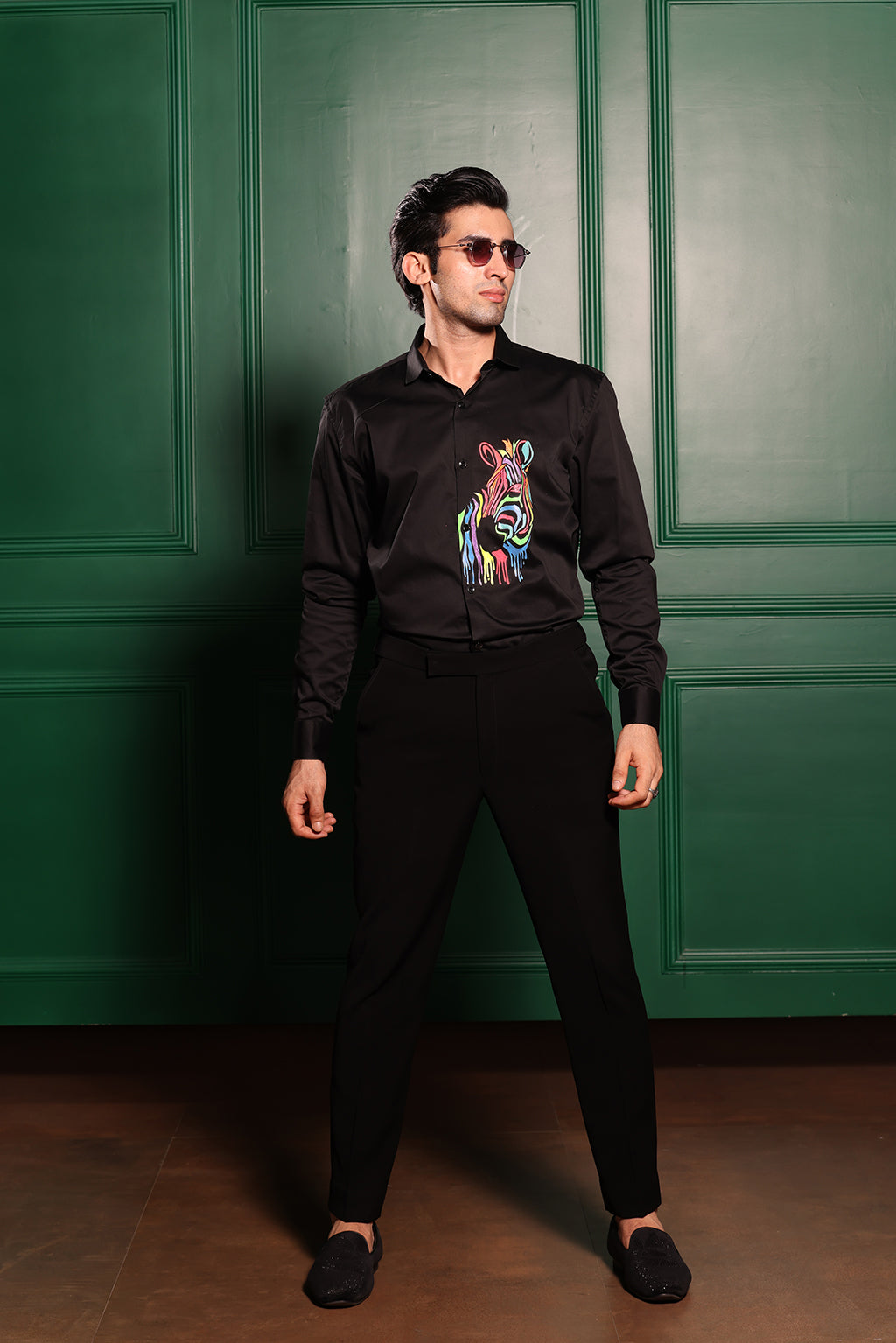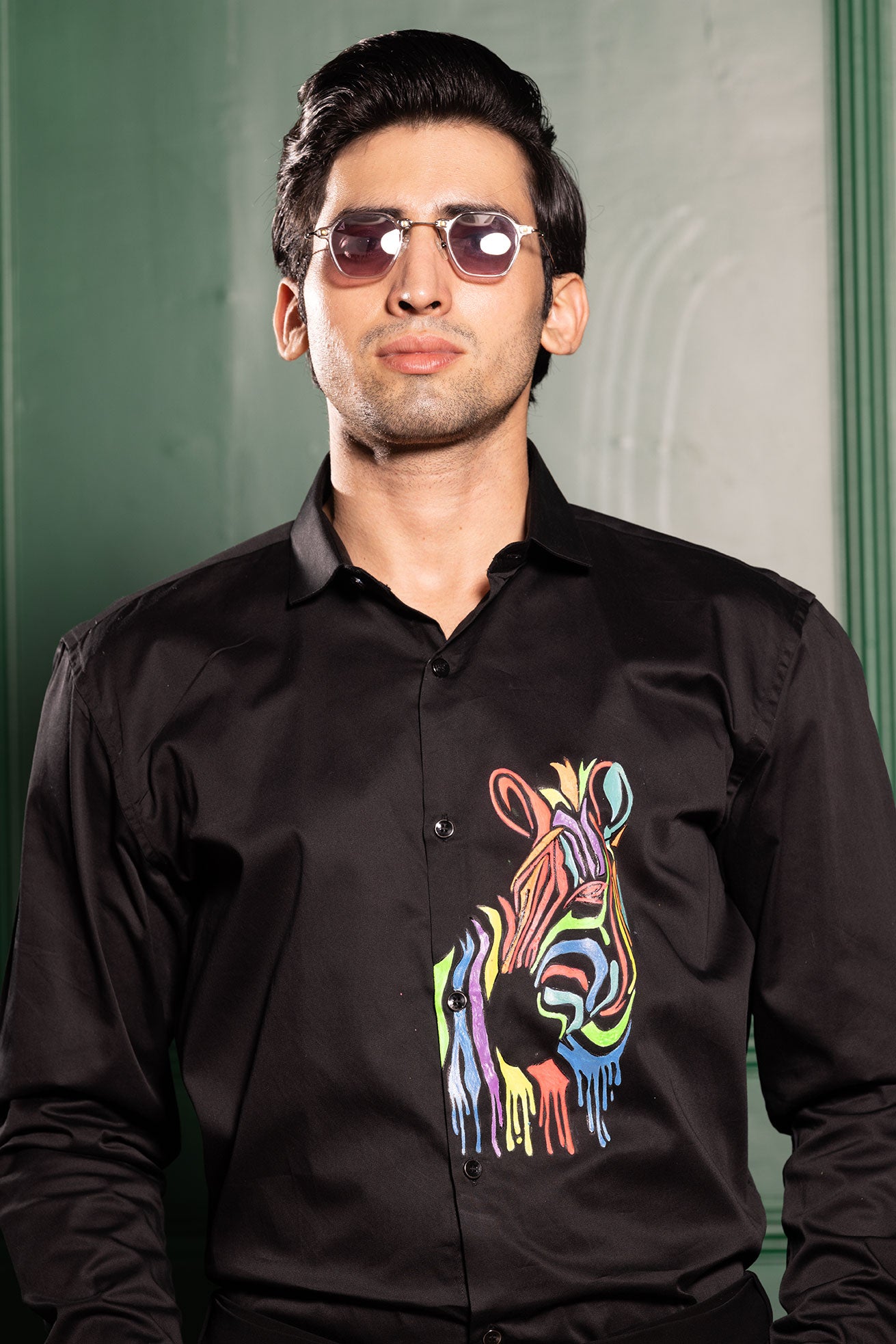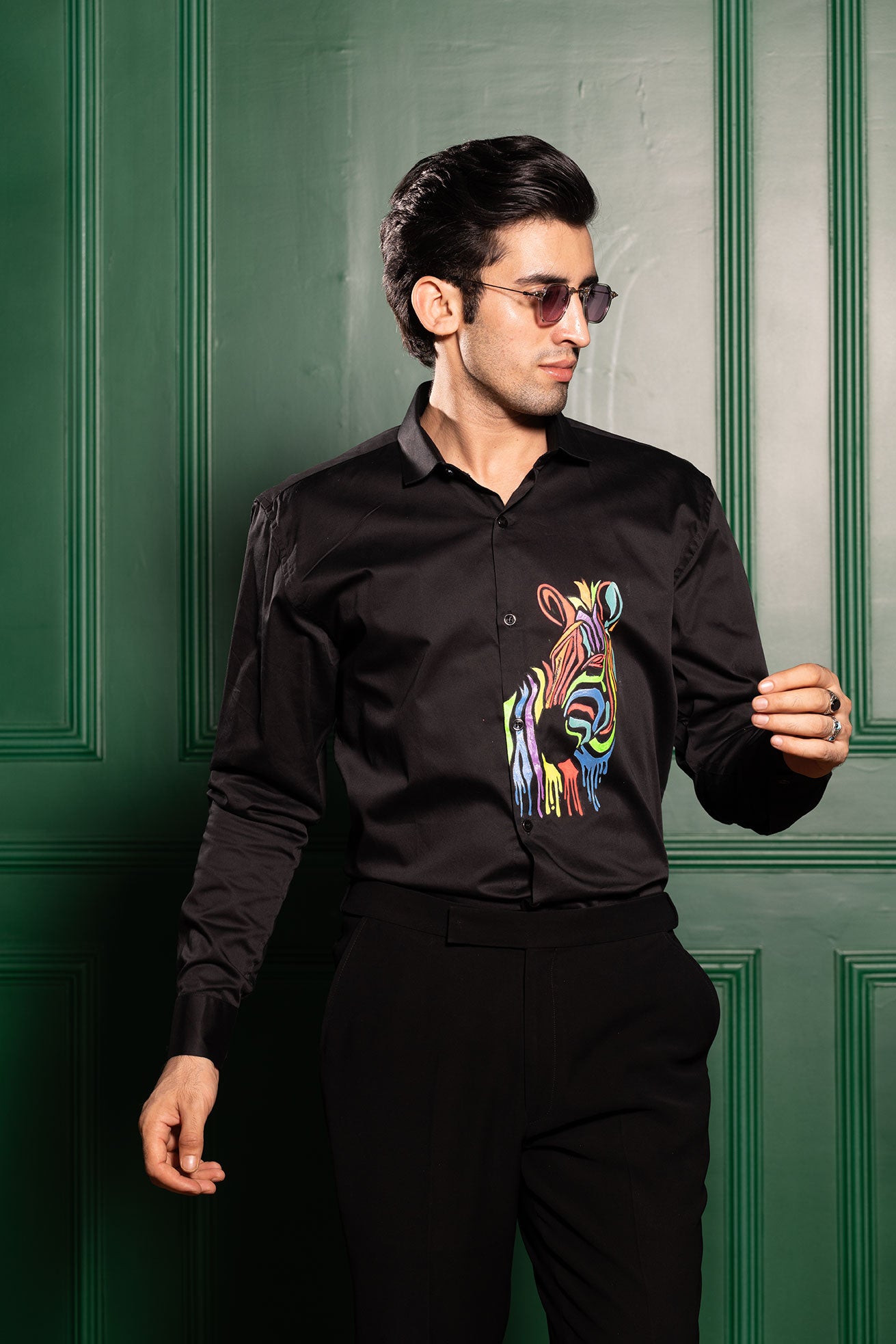 Featuring a black colour shirt in cotton base with a handpainted horse on it . Perfect wear for parties and cocktail ceremonies.