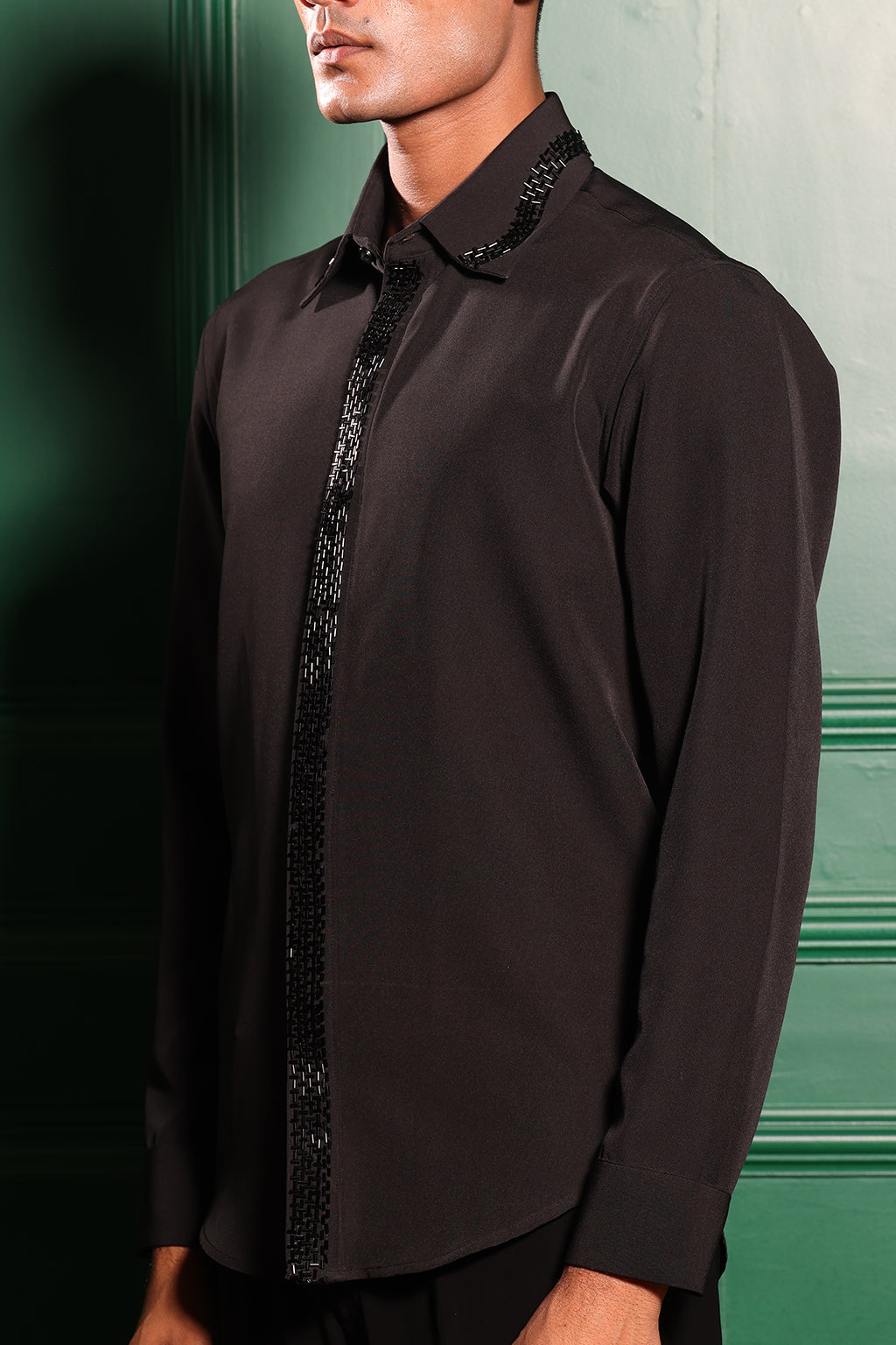 Featuring a black colour shirt in cotton lycra base with a black cut dana embroidery on it . Perfect wear for parties and cocktail ceremonies.